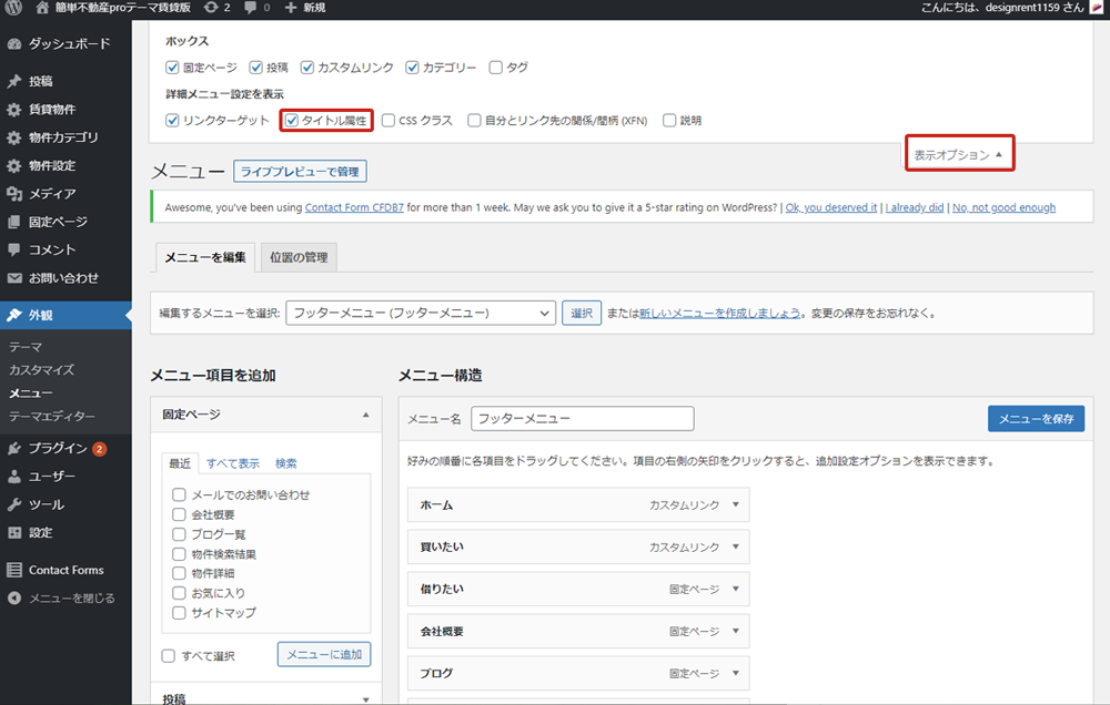 メニューを作成します。 管理画面にログインします。 外観>メニュー をクリックします。 メニュー設定画面になるので、ここでメニューを作成します。 作成するメニューは以下...