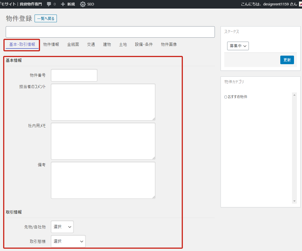 募集中であればステータスは「募集中」にします。物件カテゴリも選択します。