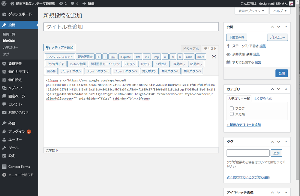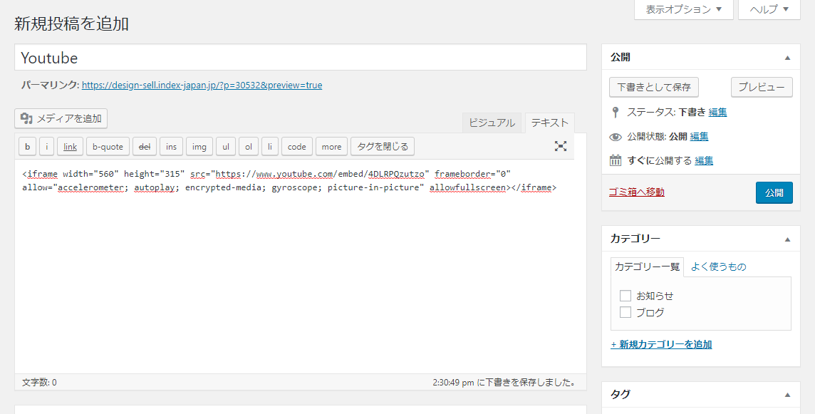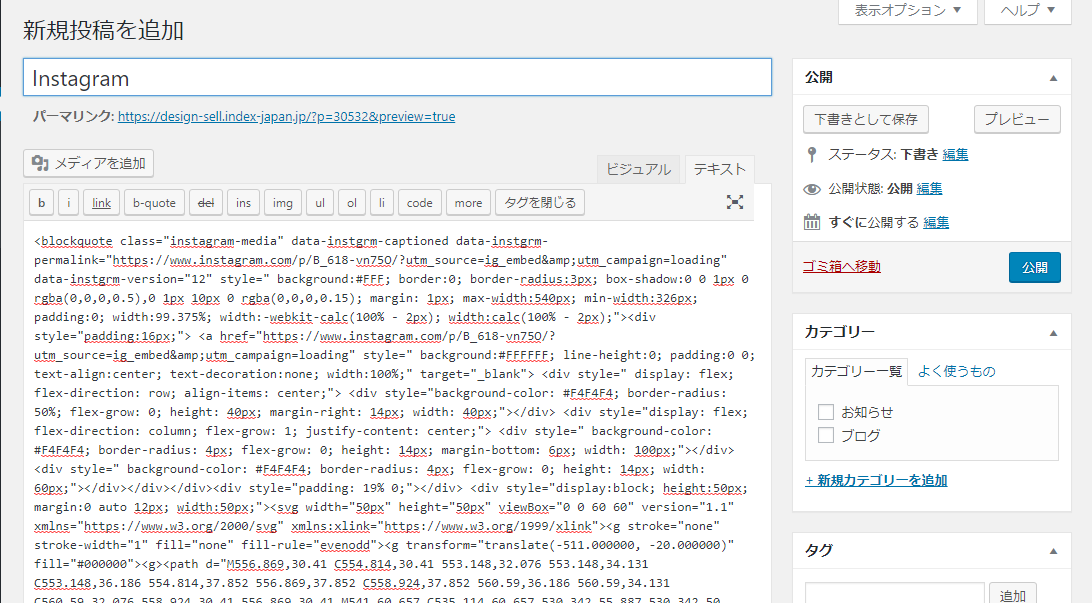 投稿の画面に戻り、投稿欄にタグをペーストし、公開または更新して完了です。