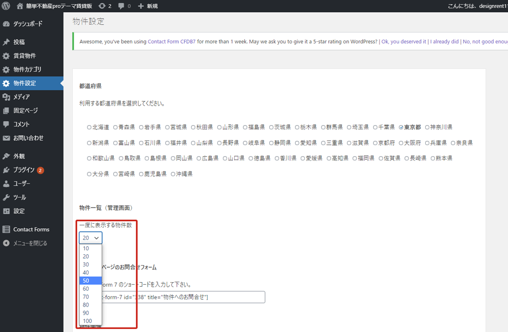 「物件一覧(管理画面)」では管理画面の「売買物件」で物件一覧を表示する際に、表示される物件数になります。表示したい物件数を選択します。