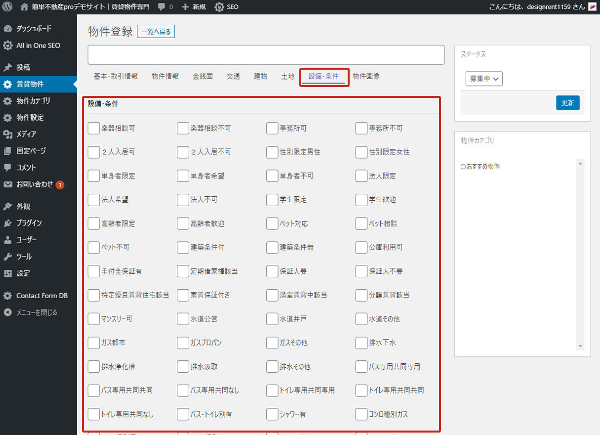 ここでは物件の設備や条件を項目にチェックすることで入力することができます。