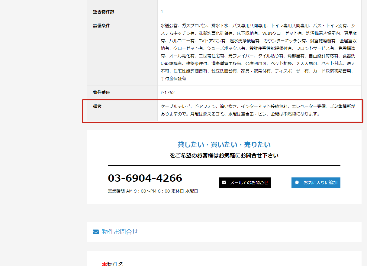 物件詳細の「物件概要」の最下部、備考の欄に表示されるコメントとなります。