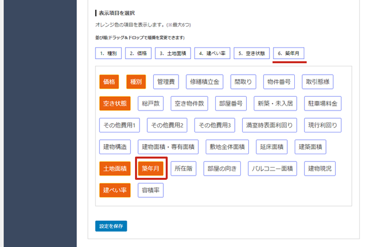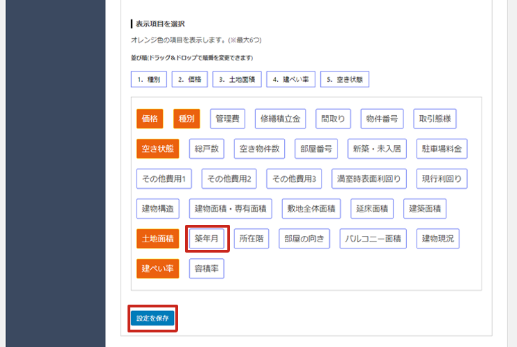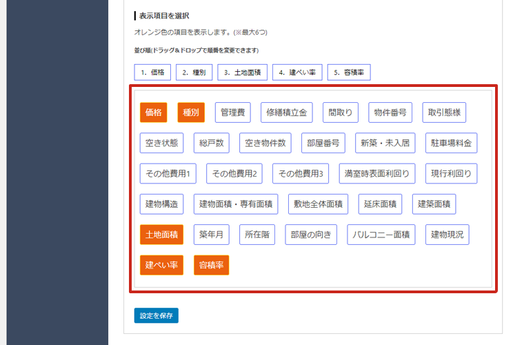 物件概要の「表示項目」は、物件詳細で表示される物件概要項目の設定です。