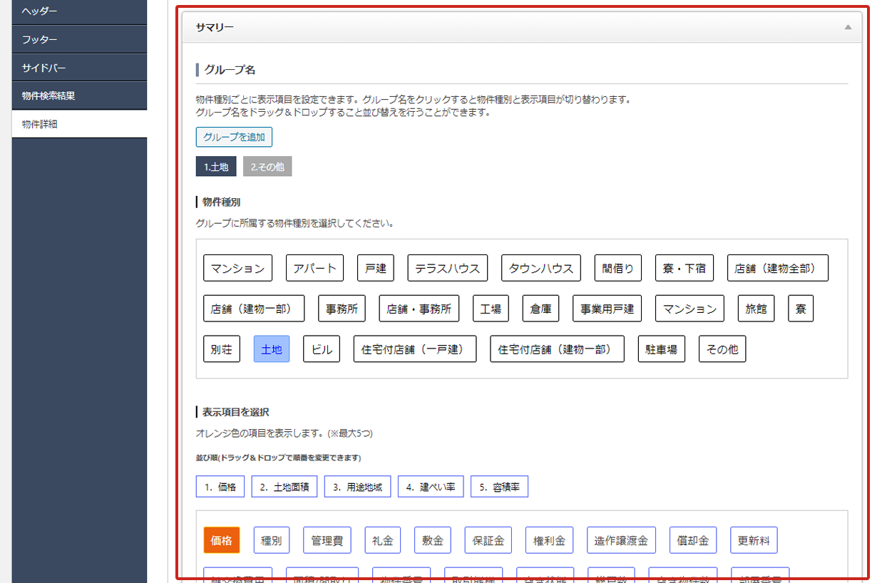 「物件詳細ページに表示する物件の項目」の設定では、グループに対する表示項目を設定することができます。