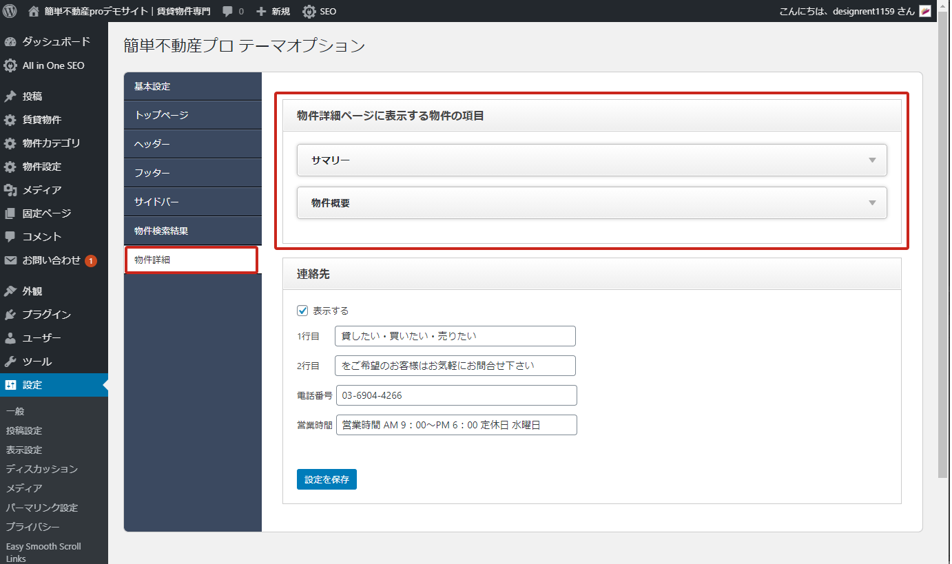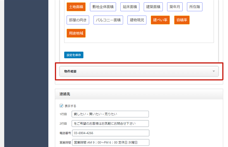「物件詳細ページに表示する物件の項目」でサマリーと物件概要を設定します。