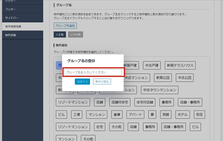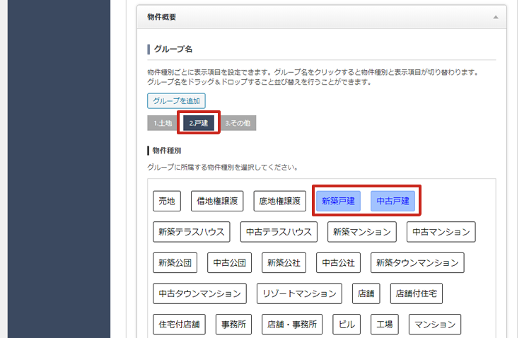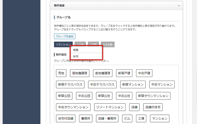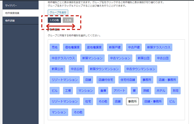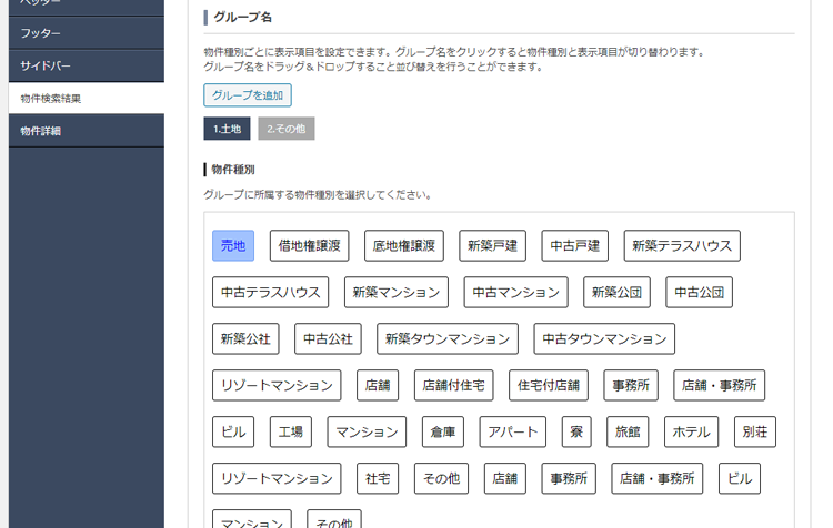 グループによって、下に並んでいる物件種別の表示項目が変わります。自社の条件に合うように、グループ名に対する物件種別をクリックして追加したり、変更します。