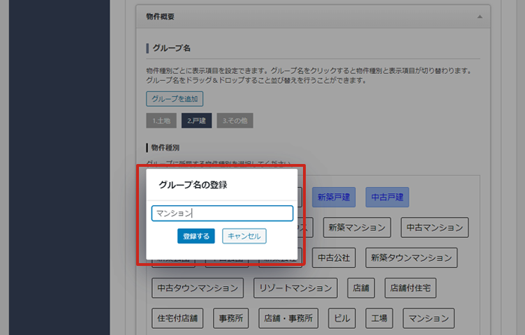 「グループ名」設定の画面になりますのでグループ名を入力します。グループ名が設定されるので、既存のグループ名に対する種別追加と同様に、追加したグループ名に対する物件種別をクリックして設定します。