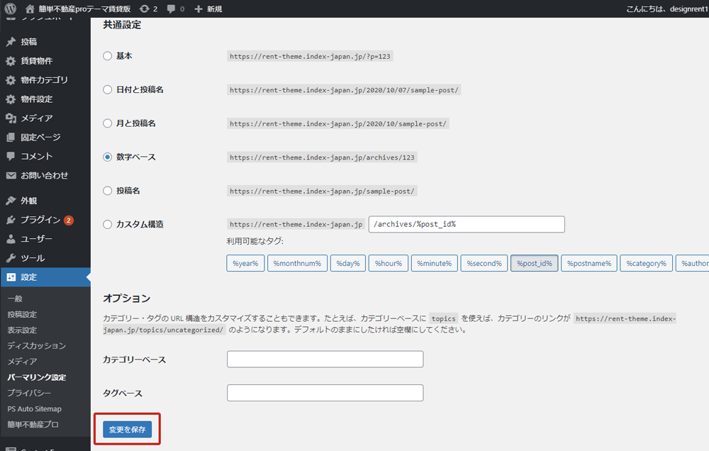 簡単不動産proではパーマリンクを数字ベースに変更する必要があります。