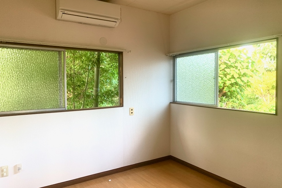 一帯が緑で囲われている敷地内に、いくつかの一戸建てが建っています。庭には鬱蒼と木や草が生えており、気温も少し低いような気がします。どの窓を開けても(開けなくても)緑の息吹を感じられる建物です。