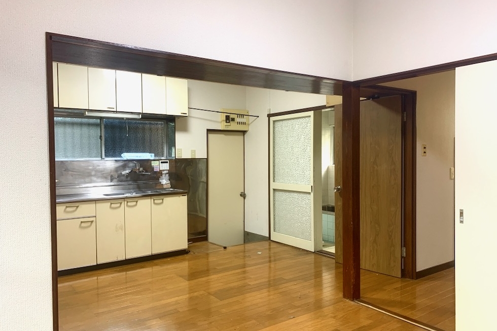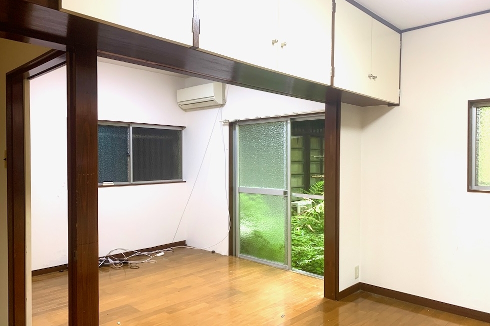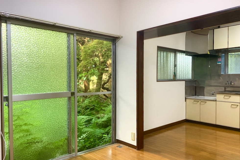 1階はLDKとして使える部屋と水回り。キッチン部分と居間部分を分けて使う使い方も良さそうです。日当たりは良いとは言えませんが、庭の緑が眺められ、静かで落ち着いた雰囲気です。